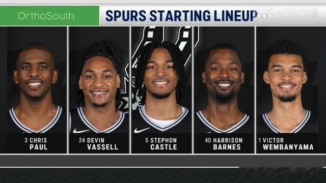 马刺队首发阵容:3号保罗、24号瓦塞尔、5号卡斯尔、40号巴恩斯、1号文班亚马